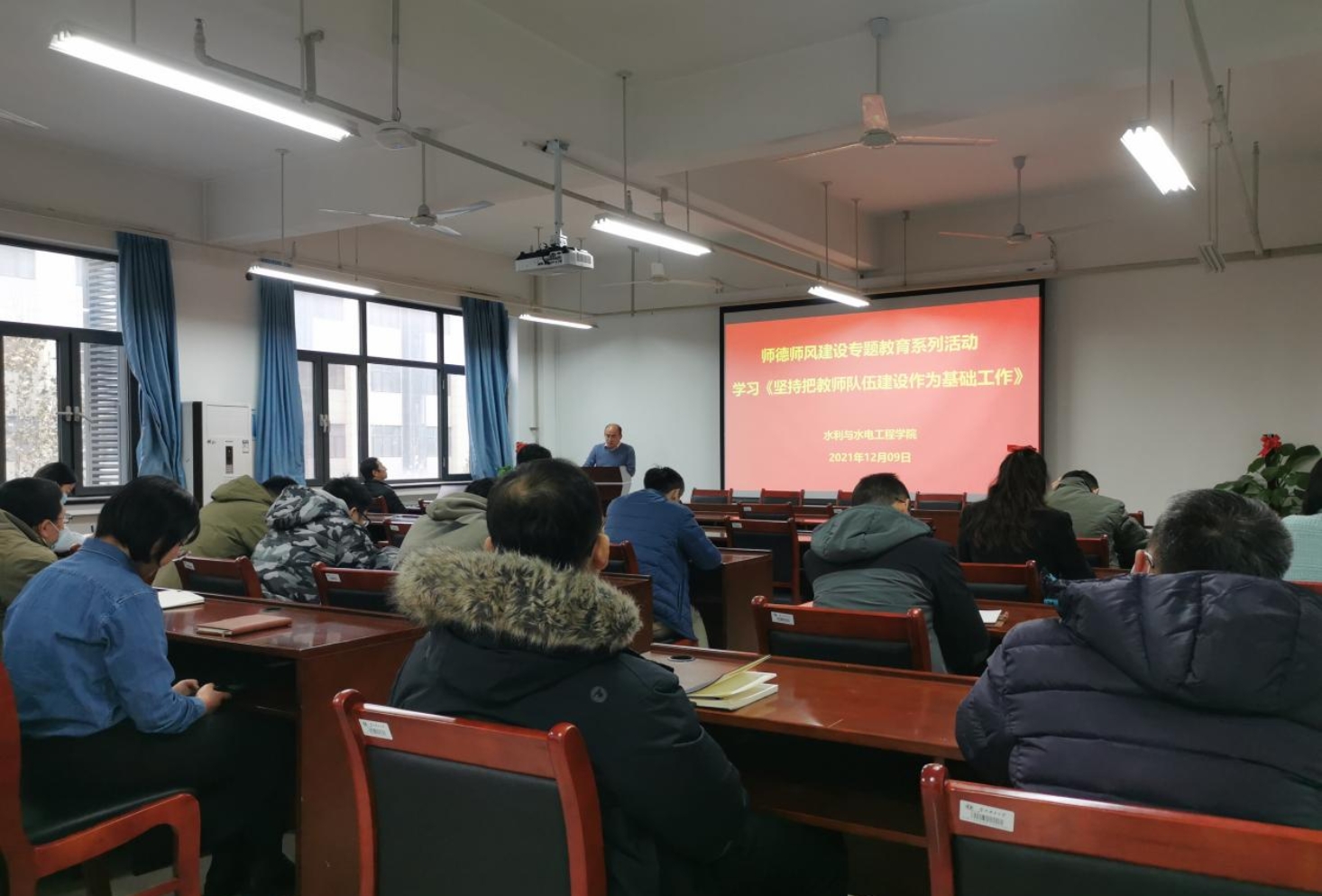 12月9日,麻豆tv 教职工学习《坚持把教师队伍建设作为基础工作》暨教师课堂教学礼仪倡议讨论,学院党委副书记杜广微、副院长王弋、全体教职工参与学习讨论,会议由党委书记刘明军主持。