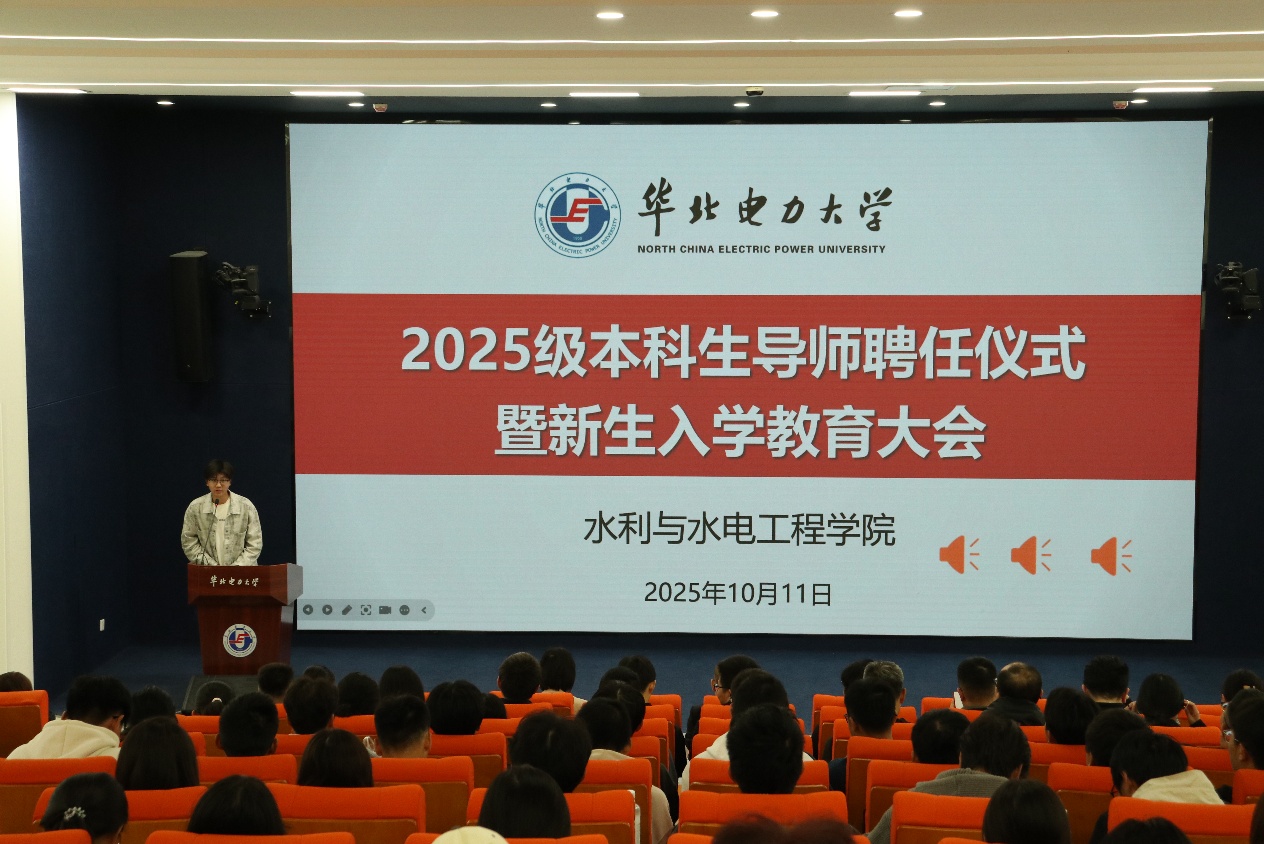 2025级本科生代表彭煜同学在发言中表达了成为一名华电水利人的自豪与担当,号召全体新生以“忠诚、干净、担当,科学、求实、创新”的新时代水利精神为指引,在推进国家水网建设的征程中贡献青春力量。