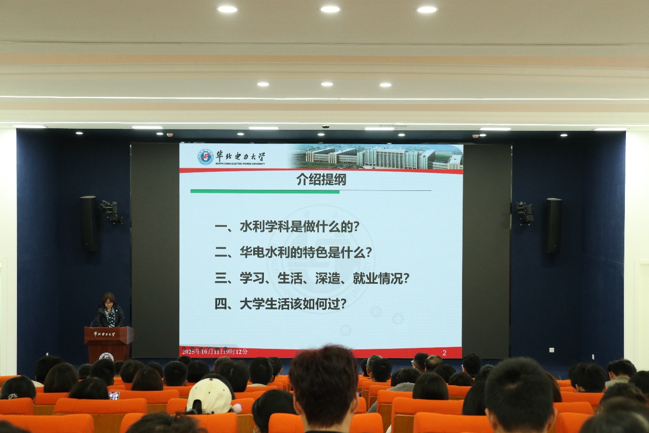 水文教研室彭杨教授为新生带来精彩的“开学第一课”。她从水利事业的根本属性出发,系统阐释了水资源的战略意义,同时从国家能源发展的需求角度出发,深入介绍了学院“水利与电力深度融合”的办学特色,阐明了我校水利学科发展历程、人才培养目标和毕业生深造就业情况。希望同学们积极转型,快速适应大学生活,将学业放在首位,正确面对困难挫折,规划好大学生活,为实现自己的人生目标砥砺奋进。